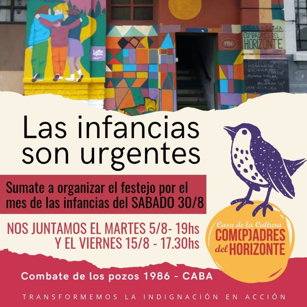 Hola! El día SÁBADO 30/8 estaremos festejando el día de las infancias.Invitamos a vecinas, vecinxs, colectivos artísticos y barriales a sumarse a la organización y festejo.Les esperamos los días martes 5/8 a las 19hs y viernes 15/8 (feriado puente) a las 17.30hs a las reuniones organizativas.LAS INFANCIAS SON URGENTES.Les esperamos.Casa de la CulturaCom(p)adres del Horizonte Combate de los Pozos 1986